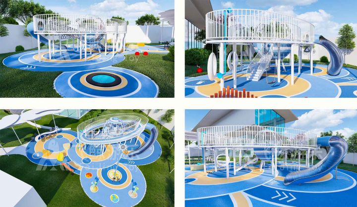 游玩设备以蓝白相间为主,沉稳、纯净,简洁风格让游玩更加沉浸,感受玩乐纯粹快乐。游玩主设备设计建造成飞船模式,儿童可在“光环”上穿梭,眺望远方,“飞船”内穿梭玩耍。游乐区还配备小型休闲游玩设备。