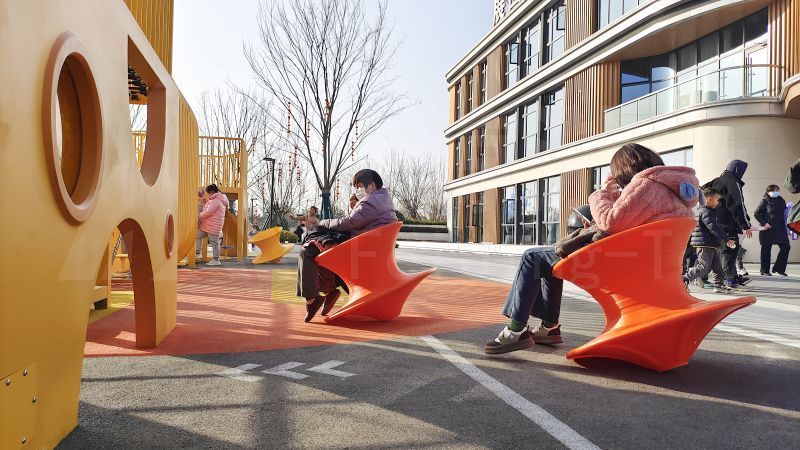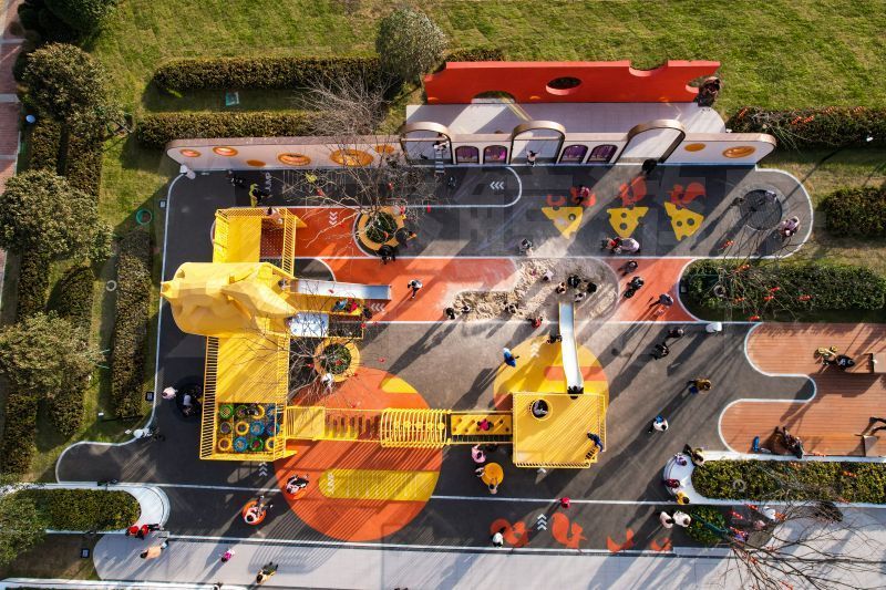 乐园地面黄橙色调的彩绘景观吸引行人不断来此探索,在乐园里玩耍或驻足休憩,包含各种地面游戏和游乐设备,让儿童和成人都可以享受轻松愉快的趣味时光。